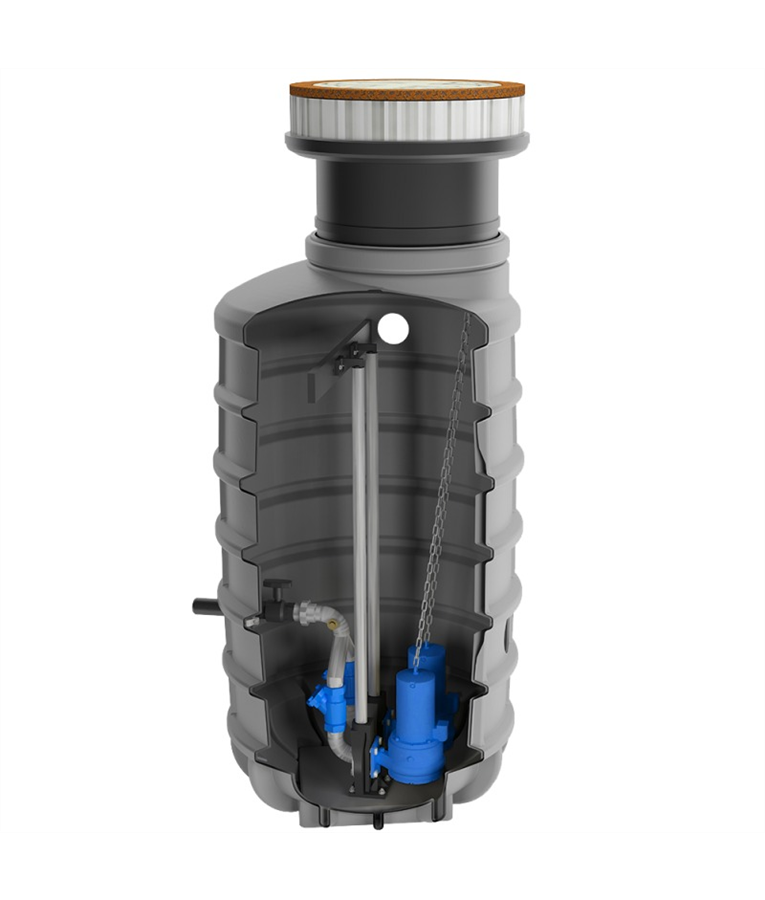 Concebida para instalação enterrada, SANIFOS 1600 litros é uma solução pronta, rápida e de baixo custo para bombear o esgoto para rede pública superior em caso de terreno em declive. O sistema possui um painel de comando inteligente com alarme.