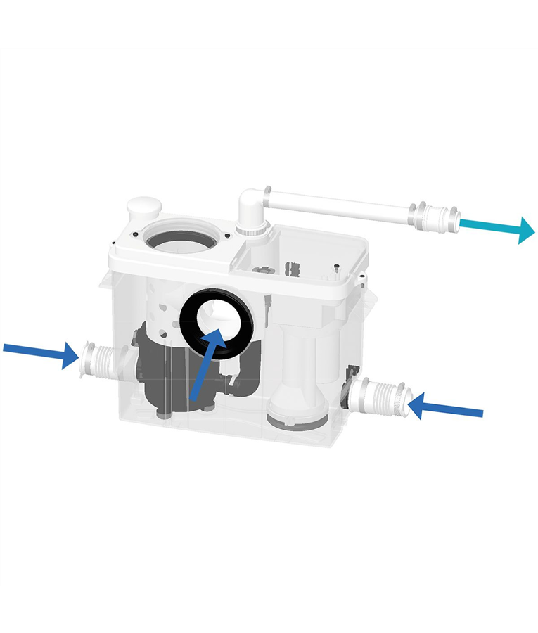 O triturador SFA Sanitrit permite criar um banheiro em qualquer lugar, sem quebrar o piso, mesmo sem escoamento gravitacional. Uma entrada de água, uma saída de 32 mm e uma tomada 220 V são suficientes para instalar o triturador sanitário.